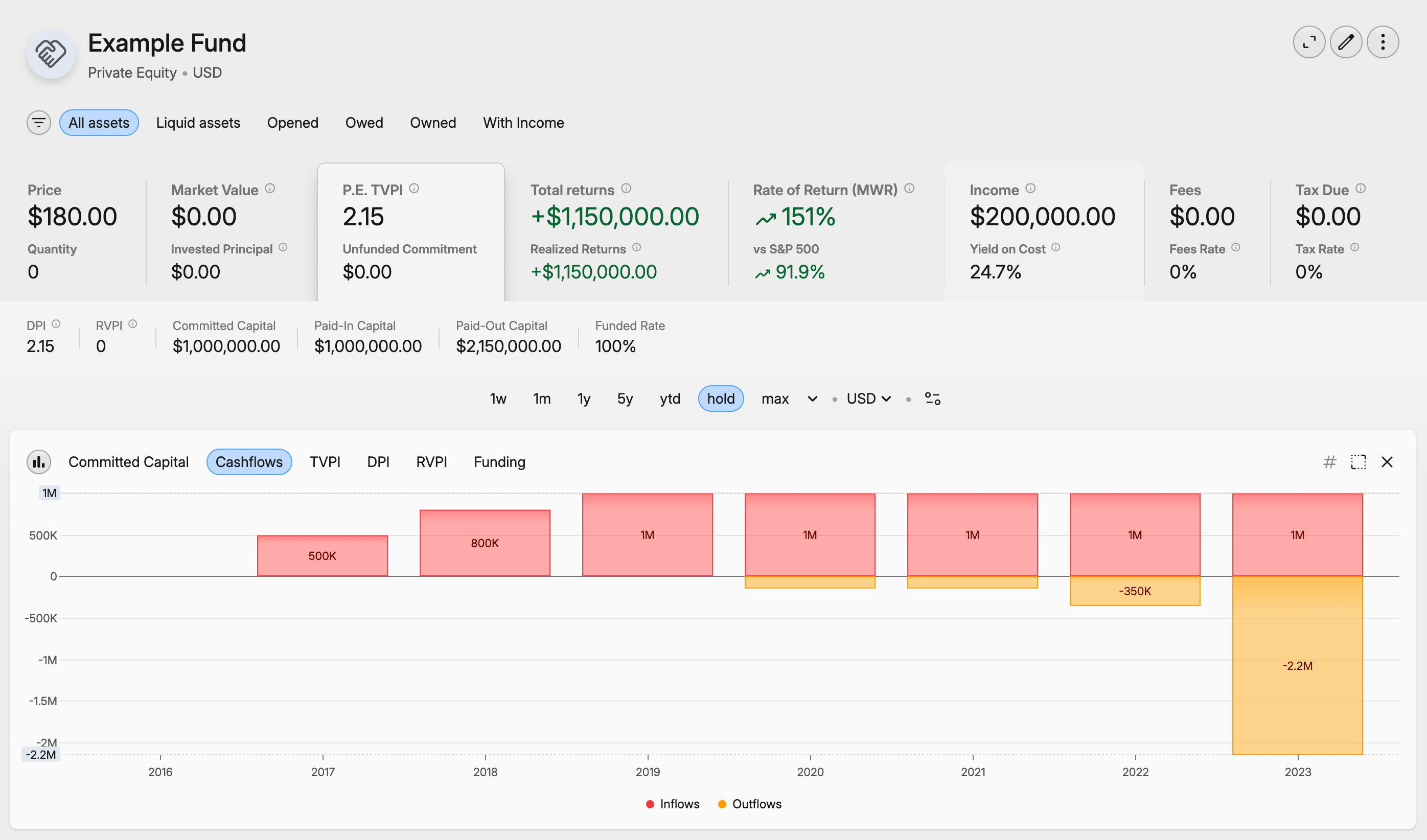 A new PE metrics tab appears whenever you open a Private Equity asset or the Private Equity type view, showing the metrics that define PE performance: