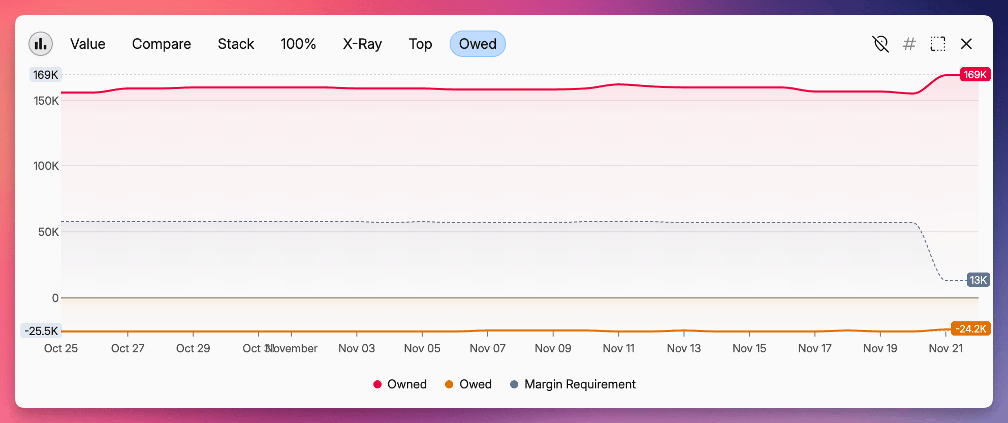 When shorting stocks or options, visualization is a helpful safety tool. You can now check your margin requirements right on the Owed chart. It will display a dotted line indicating the minimum assets required on your account to avoid a margin call, helping you keep an eye on your safety buffer.