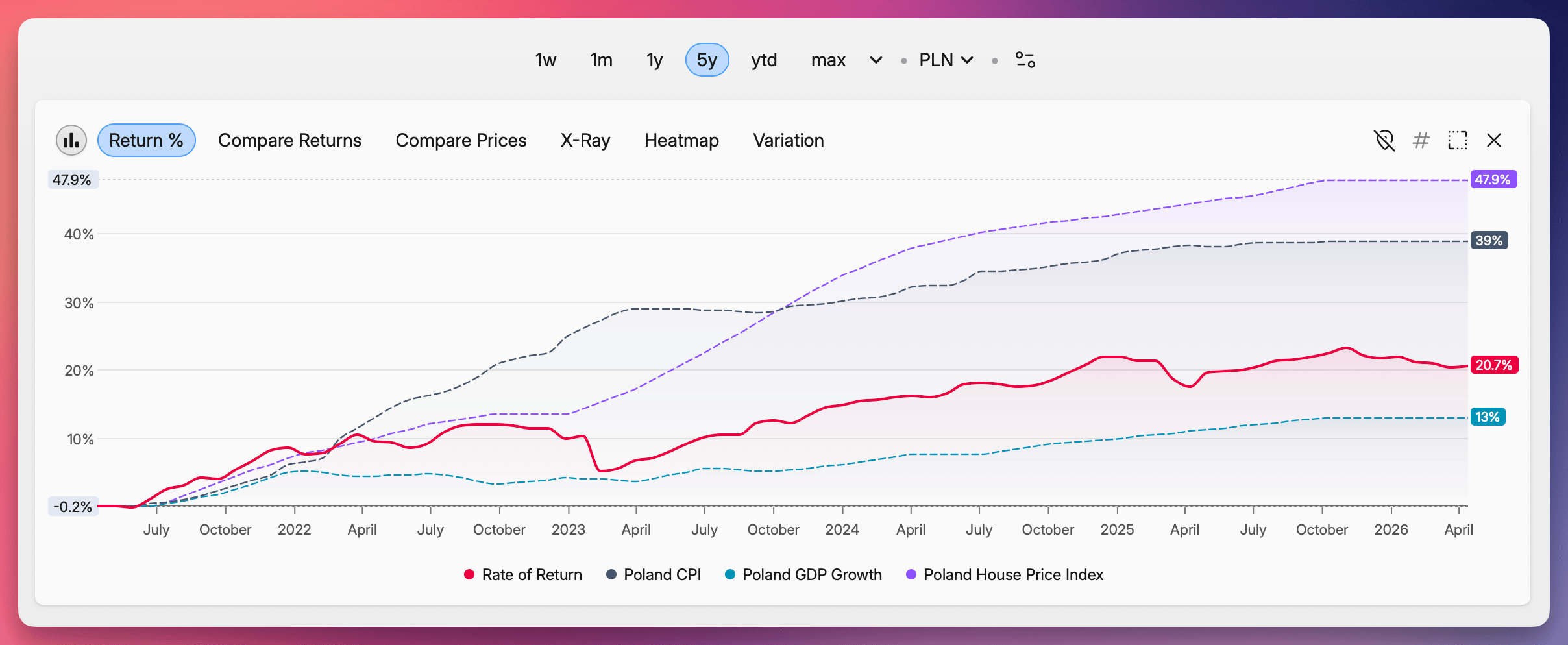 Añade el IPC de EE. UU. o el IPC de Polonia junto a tu cartera y comprueba si tu línea de rentabilidad queda por encima o por debajo. - ¿Cómo se compara mi cartera inmobiliaria con el mercado de la vivienda en general?