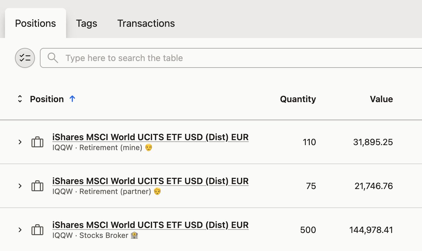 This way, no matter where the asset is, it will have the same price history, tags and taxonomies. By opening the asset, you will also see all your positions across accounts.