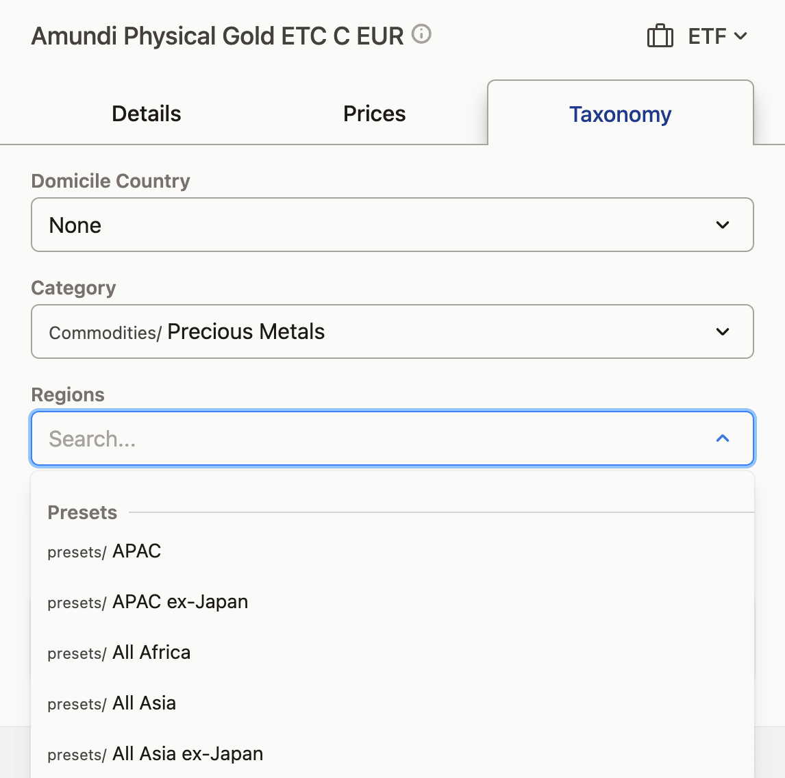 If you add any custom assets, you can assign them to the same taxonomies or create new ones to compare your custom assets with the rest of your portfolio.